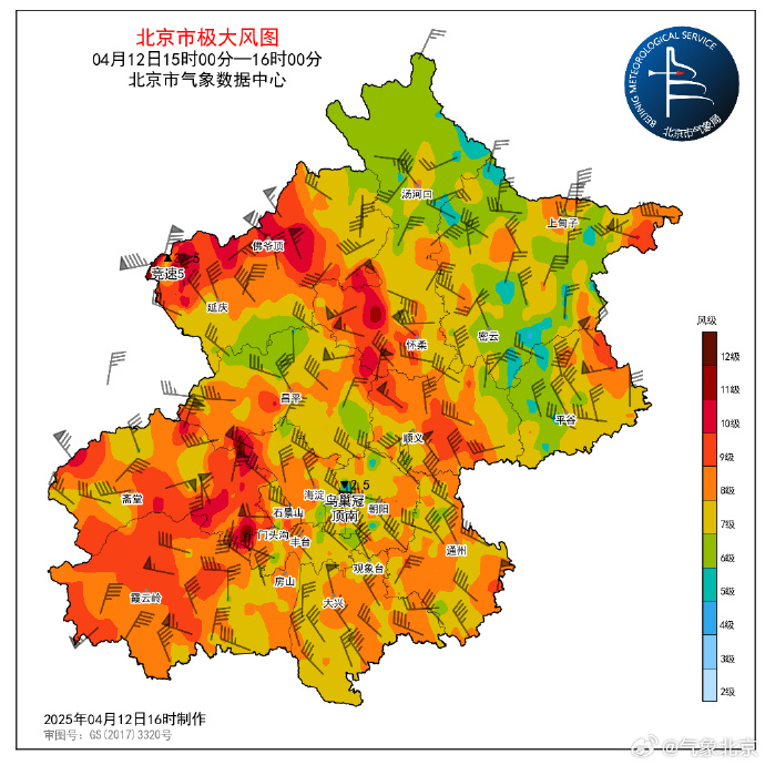最近1小时(12日15-16时)北京市部分地区阵风9~11级,山区局地13级。全市有91个测站极大风达9级以上(占比16.0%),29个测站极大风达10级以上(占比5.0%)。10级以上的站出现在海淀、丰台、房山、昌平、怀柔、门头沟、延庆。全市最大阵风风速:高山站延庆区竞速5站37.5米/秒(13级);浅山区怀柔白木31.7米/秒(11级);平原地区怀柔上王峪27.7米/秒(10级)。