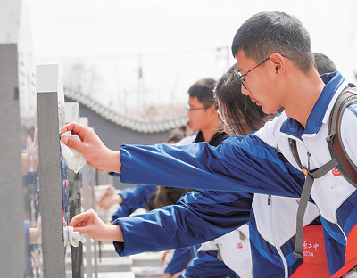 2024年4月3日,学生在任山河烈士陵园擦拭烈士墓碑。