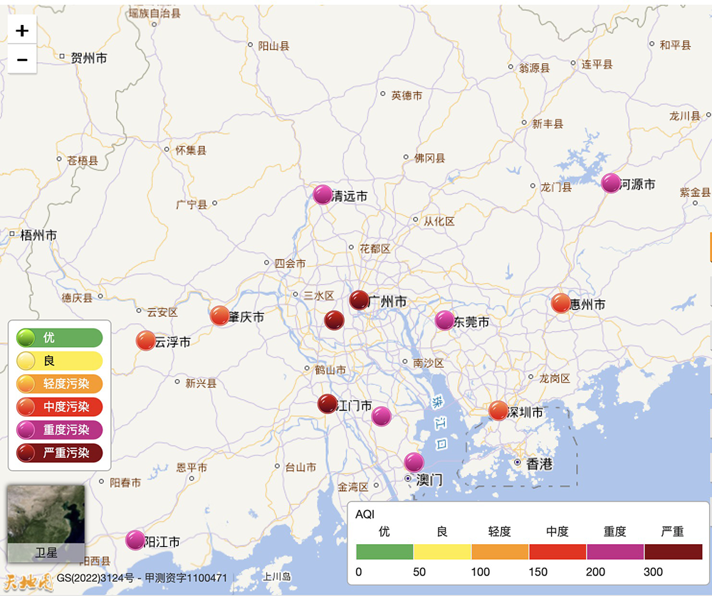 根据广东省生态环境厅官网监测系统,4月13日11时,广东21个地级以上城市的AQI(空气质量指数)均在110以上,空气质量最为良好的揭阳AQI也有114,属于轻度污染。其中,广州、佛山、韶关、江门等四地的AQI均破了300。而空气质量最差的广州,其AQI达320、PM10达436 μg/m³。