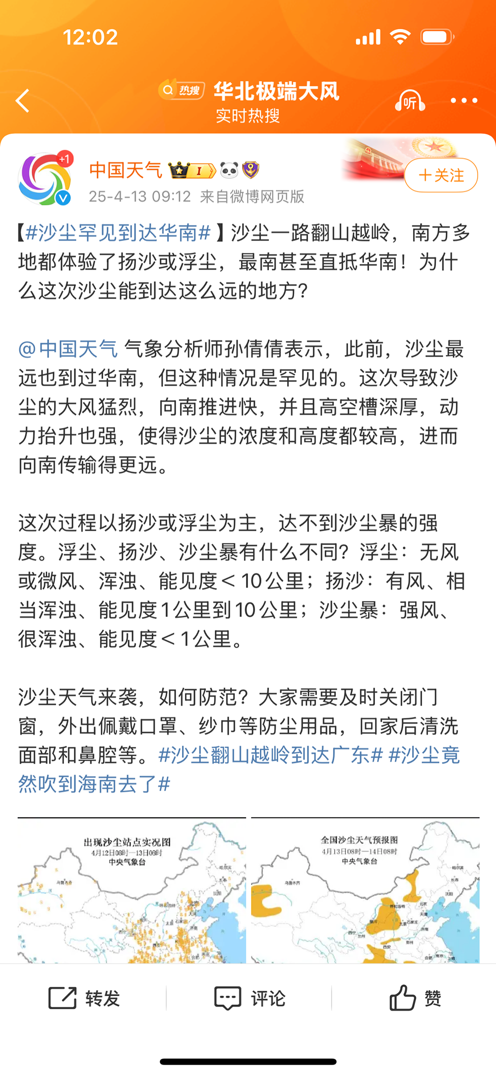 据微博@中国天气 4月13日发布的消息,气象分析师孙倩倩表示,此前,沙尘最远也到过华南,但这种情况是罕见的。这次导致沙尘的大风猛烈,向南推进快,并且高空槽深厚,动力抬升也强,使得沙尘的浓度和高度都较高,进而向南传输得更远。
