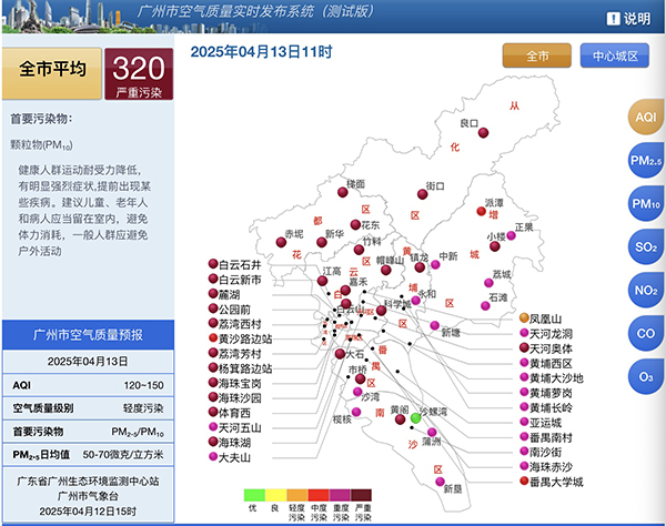另据广州市空气质量实时发布系统监测数据,4月13日11时,广州AQI全市平均达320,属于严重污染。
