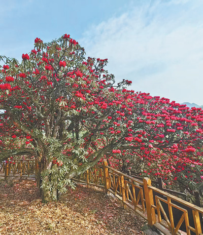 山顶处,一棵被木栅栏围起来的杜鹃树格外显眼:树干直径约80厘米,树高数米,花朵密密匝匝挂满树冠……这棵树的树龄超过1200年,粗糙皲裂的树干写满岁月沧桑。
