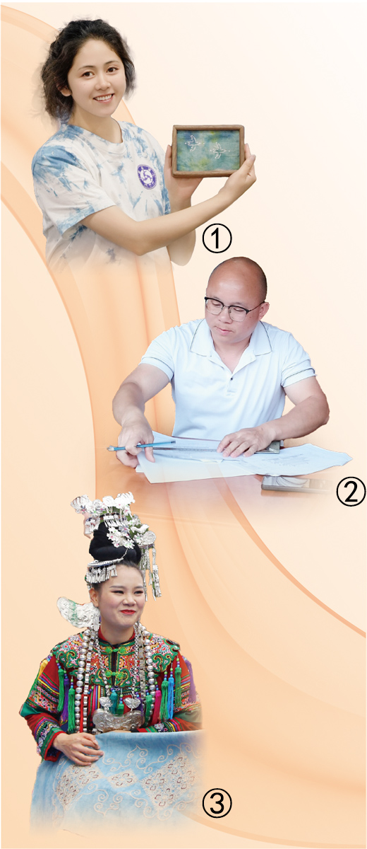 图①:陆江磊展示蜡染刺绣摆件产品,陆港春摄。图②:杨通敏在绘制木构建筑草图,受访者供图。图③:吴兴兰身着盛装进行表演,钟声丽摄。