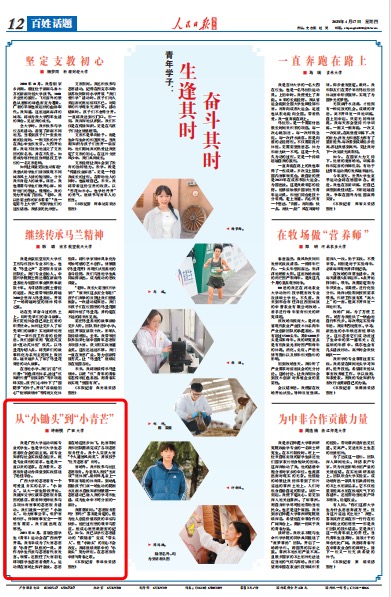 编者按:4月17日,《人民日报海外版》刊发了《青年学子: 生逢其时 奋斗其时》系列报道,其中《从“小锄头”到“小青芒”》一文讲述了广西大学学生许新悦积极参与志愿活动并获得成长的故事。具体内容摘录如下: