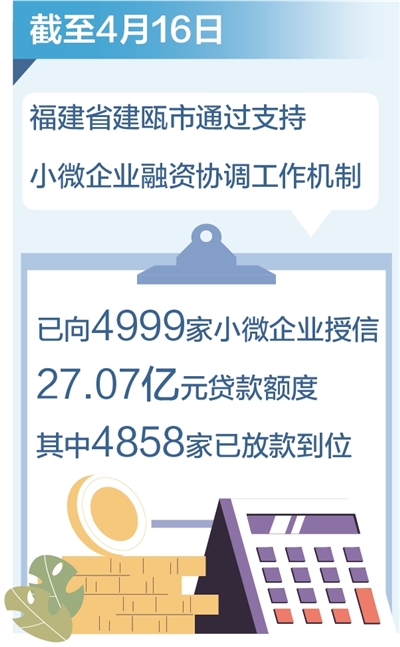 截至今年4月16日,通过支持小微企业融资协调工作机制,建瓯市已向4999家小微企业授信27.07亿元贷款额度,其中4858家已经放款到位。“最难得的是其中有新增贷款客户1071家,贷款4.01亿元,这些都是之前没能‘摸出来’的刚性需求。”刘相龙介绍。