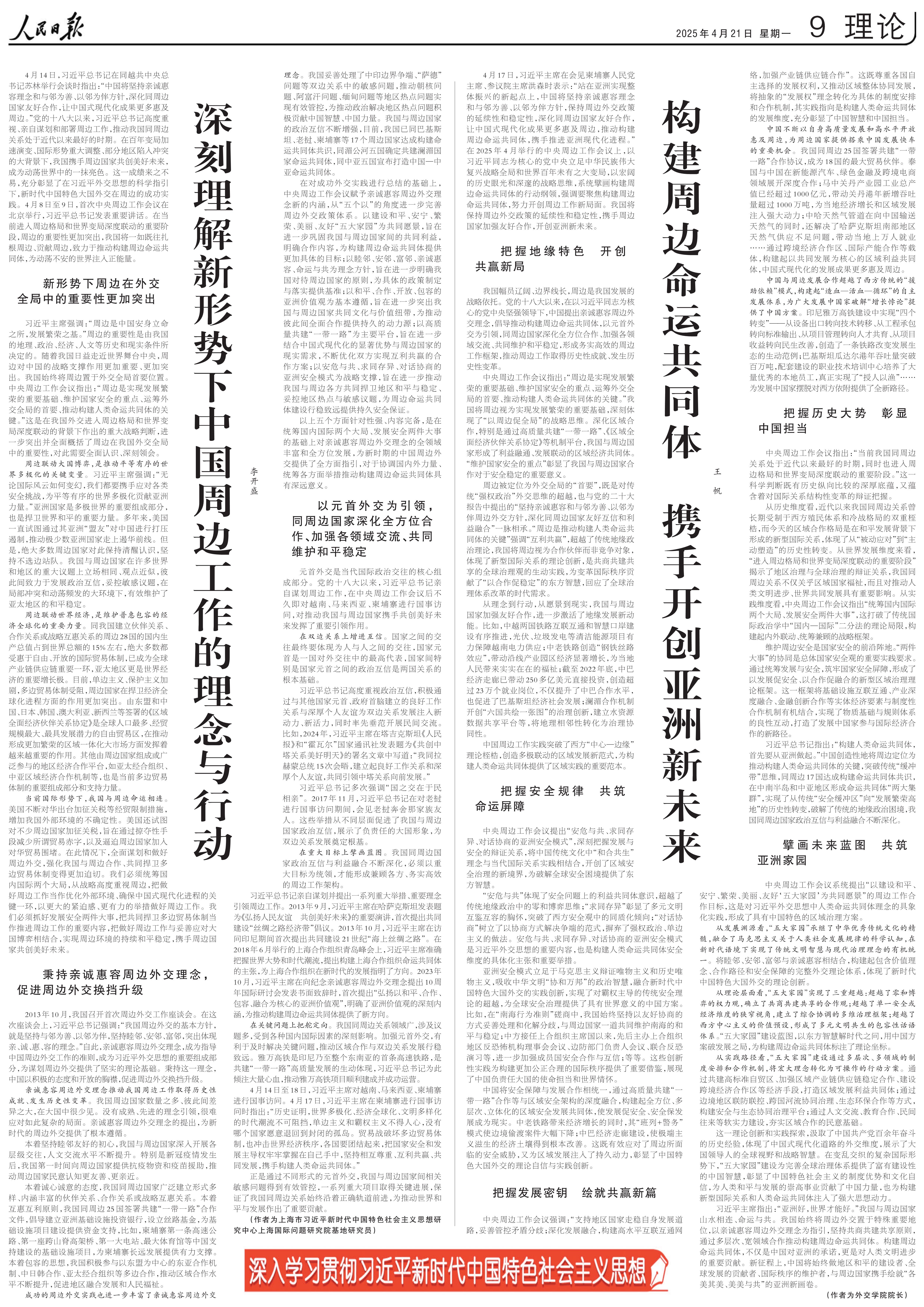 4月17日,习近平主席在会见柬埔寨人民党主席、参议院主席洪森时表示:“站在亚洲实现整体振兴的新起点上,中国将坚持亲诚惠容理念和与邻为善、以邻为伴方针,保持周边外交政策的延续性和稳定性,深化同周边国家友好合作,让中国式现代化成果更多惠及周边,推动构建周边命运共同体,携手推进亚洲现代化进程。”在2025年4月举行的中央周边工作会议上,以习近平同志为核心的党中央立足中华民族伟大复兴战略全局和世界百年未有之大变局,以宏阔的历史眼光和深邃的战略思维,系统擘画构建周边命运共同体的行动纲领,强调要聚焦构建周边命运共同体,努力开创周边工作新局面。我国将保持周边外交政策的延续性和稳定性,携手周边国家加强友好合作,开创亚洲新未来。