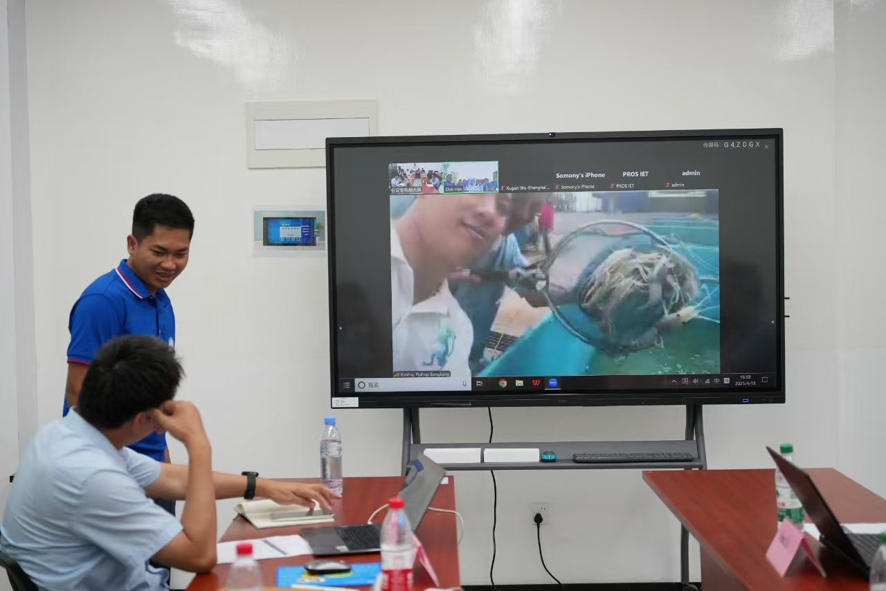 经过4年多的持续技术示范和合作研发,柬埔寨茶胶省的稻虾种养面积已经发展到39个农户、43.5公顷。透过镜头,吴旭干老师和团队成员看到了鲜活的罗氏沼虾苗,团队翻译、上海海洋大学柬埔寨留学生贺子真将吴旭干说的英文翻译成柬埔寨语;屏幕另一端,柬埔寨的养殖户一边比划一边热烈讨论。