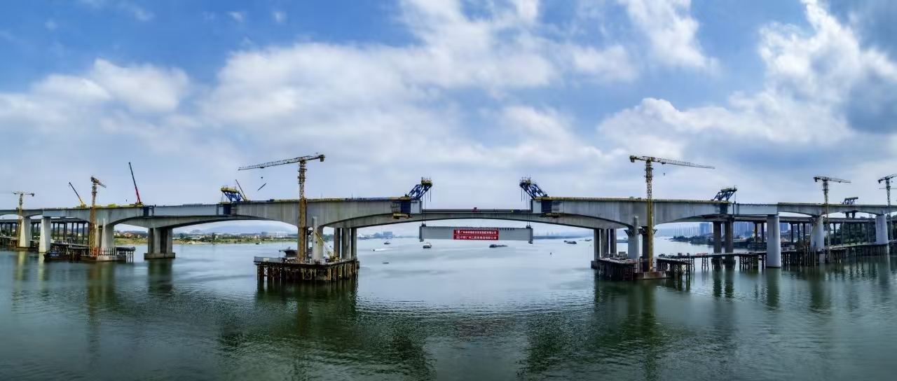 广湛高铁佛山特大桥全长15.652公里,融合了斜拉桥、系杆拱桥、转体连续梁、钢混刚构桥等多种桥梁结构形式,堪称一座“桥梁小博物馆”。其中,跨西江钢混混合连续刚构桥采用悬臂浇筑混凝土箱梁与钢混结合梁的组合方式。钢梁施工采用了新研制的多功能一体化工装设备,实现一次整体提升。施工区域处于西江一级繁忙航道,整体提升高度接近40米,施工难度极大。