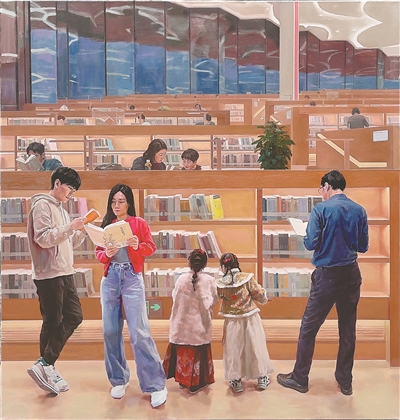油画《文化港湾——北京城市图书馆》,作者王汉一。 |