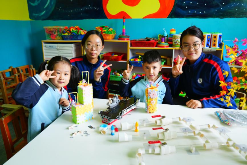 在镇海幼儿园的科学探究教室,孩子们在支教老师的带领下围坐一起组装“山东号”航母模型。“这艘航母是祖国自主研发的‘海上长城’,每一架舰载机都肩负着守护海疆的使命。”支教老师郭可盈指着模型讲解时,孩子们眼中闪烁着好奇与自豪。
