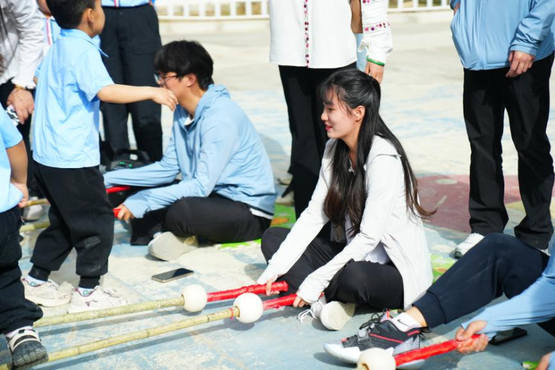 这支由天津科技大学师生组成的援疆支教团队,创新采用沉浸式教育模式,让爱国主义教育更具吸引力和实效性。在幼儿园的家长开放日现场,《天地龙鳞》的激昂旋律响彻校园。孩子们与家长一起,跟随着支教老师的示范,整齐地敲击鼓点。随后开展的踢毽子、顶碗、竹竿舞等传统游戏环节,更是让现场气氛推向高潮。“我们特别设计了这些互动环节,让孩子们在体验传统文化的同时,潜移默化培养爱国情感。”支教老师郭琳说。