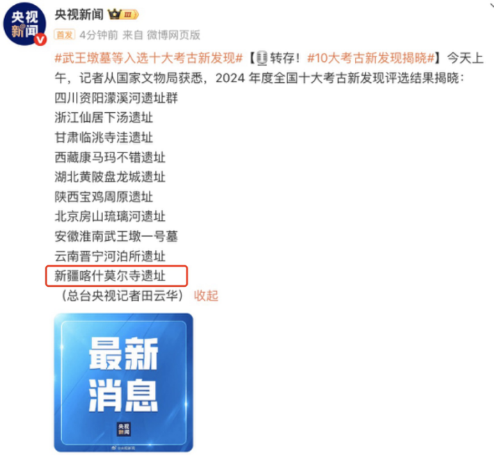 4月24日,由中央民族大学和新疆文物考古研究所联合考古发掘的新疆喀什莫尔寺遗址入选2024年度全国十大考古新发现。这是迄今发现我国西部、年代最早、延续时间长且发展演变清楚、保存较完整的大型地面土建筑佛寺遗址,是早期大型地面佛寺的典型代表,提供了我国早期佛寺布局及其发展演变的样本。