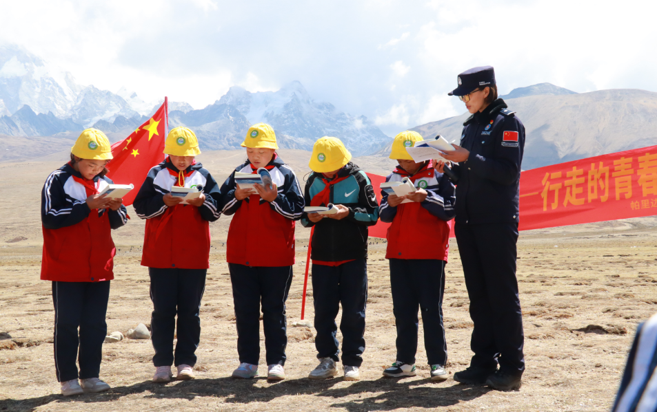 “今天的例行巡逻任务是踏查边境是否存在可疑标志,大家是否明白?”“明白!”在整齐有力的声音中,由移民管理警察、学生和志愿者组成的巡逻小队整装出发。在民警旦增多吉的带领下,大家齐声高喊呼号“1234”和口号“守护边疆,书香同行”,用坚定的脚步丈量祖国的边境线,以实际行动践行爱国之情。“穿着警用装备巡逻太辛苦了,我觉得达娃和黄月亮哥哥的戍边生活不容易,移民管理警察叔叔的戍边生活也不容易啊,我要给他们点赞!”穿戴警用装备的小学生仁青达杰喘着粗气伸出了大拇指。巡逻间隙,在旦增多吉的带读下,大家高声朗诵《少年中国说》,进一步明确了实现中国梦的少年责任,切实凝聚了实现中华民族伟大复兴的强大合力。