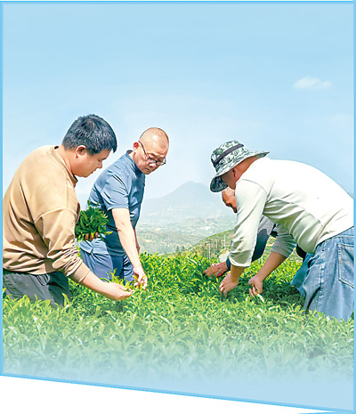 江岔村驻村第一书记陈毓(左二)在高山茶园查看茶叶品质。陈郑耀摄(人民视觉)
