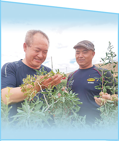 枸杞采摘期,吊堡子村驻村第一书记李宗仁(左)来到枸杞地里查看枸杞产量情况。李媛媛摄(人民视觉)