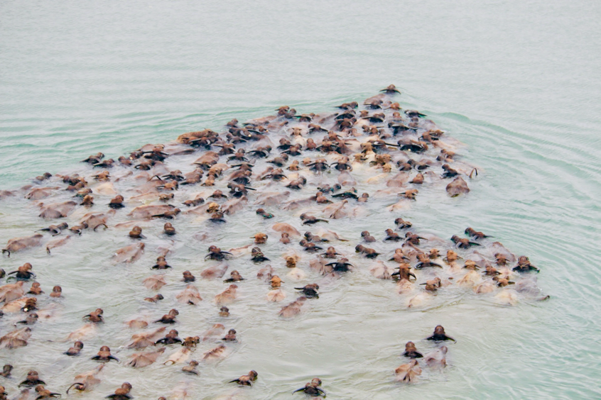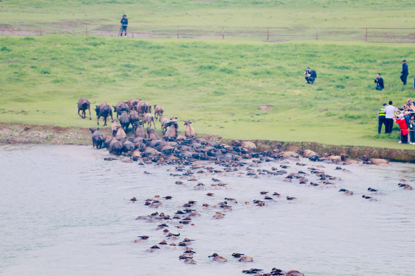 水花飞溅间,牛群气势磅礴,登岛后悠然啃食青草、追逐嬉戏,生动勾勒出一幅人与自然和谐共生的壮美画卷。“太震撼了!江面上水花四溅,水牛勇往直前的样子让人难忘!” 现场游客纷纷感叹。