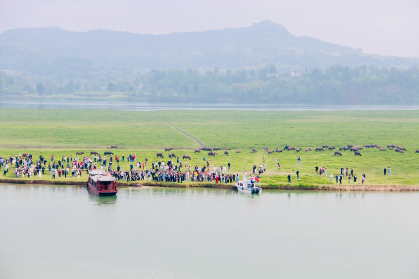 嘉陵江蜿蜒千里,在蓬安留下 89 公里的秀美江段。江中的日月二岛相互守望,2000 亩天然草地滋养万物。每年暮春至初秋,牛群日出登岛、日落归栏,“百牛渡江” 奇观经年累月形成,成为蓬安生态旅游的金字招牌。自首次举办放牛季活动以来,16 年间,这一奇观吸引了无数游客,带动当地文旅经济蓬勃发展。