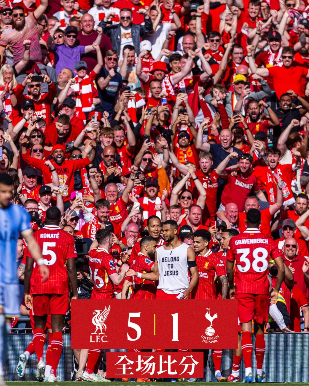 进入下半场,主队攻势不减。萨拉赫第63分钟在反击中完成破门,随后又制造乌多吉乌龙,全场比分被定格在5:1。终场结束前,主队球迷高唱队歌《你永不独行》(You'll Never Walk Alone),共同迎接属于球队的第二座英超冠军奖杯。