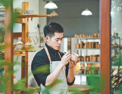 制瓷的日子多少有些单调,除了必需的外出,叶晨曦通常每天早上8点半进工作室,一待就是一整天。脑中的排期表总在动态更新,哪批瓷器该上釉、哪批瓷器该素烧,容不得一点儿耽搁。6年历练,他自觉才掌握父亲的三成功力,好在龙泉青瓷的含蓄沉静,已在不知不觉塑造他的性格和内心。“不急不躁,才能守住青瓷的根脉。”叶晨曦说。