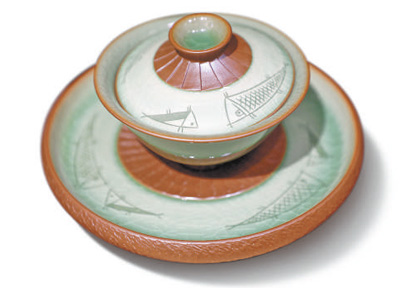 叶晨曦工作室的展示架上,摆放着一套梅子青茶具。不同于花卉、蝙蝠等秀丽富贵的传统图案,茶具上的纹样是几条看得出刻痕毛边的朴拙游鱼。