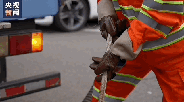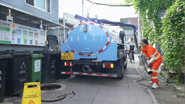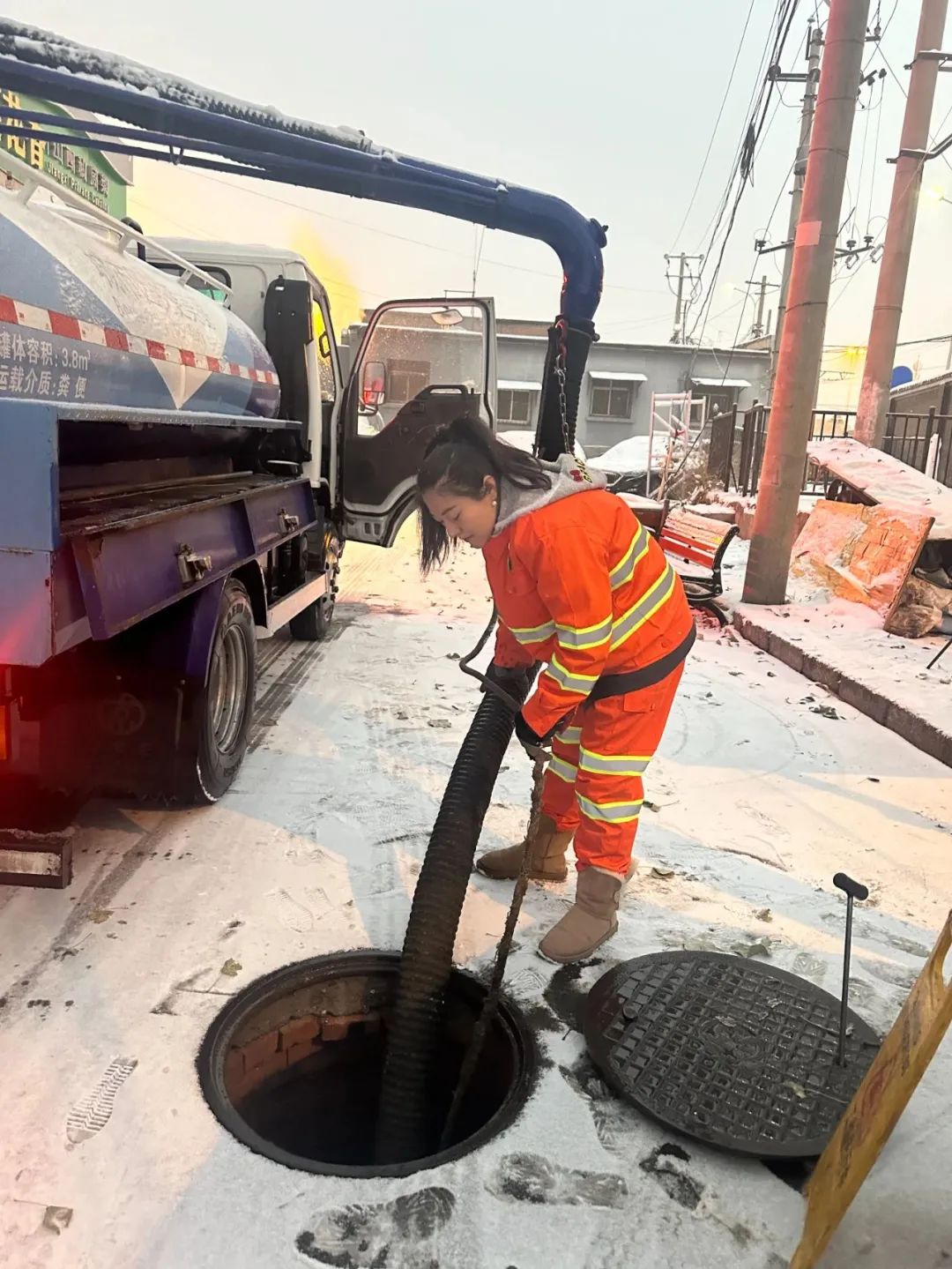 她需要抱住抽粪车上的粪管