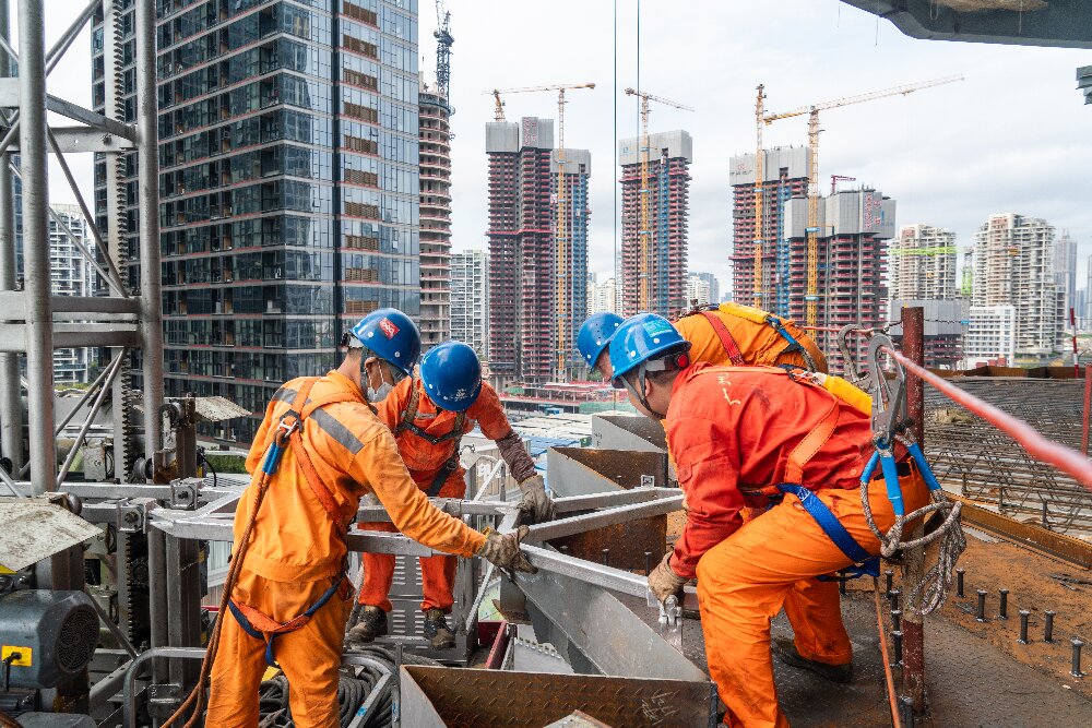 图为深圳湾超级总部基地C塔项目一线建设者正在安装电梯附墙