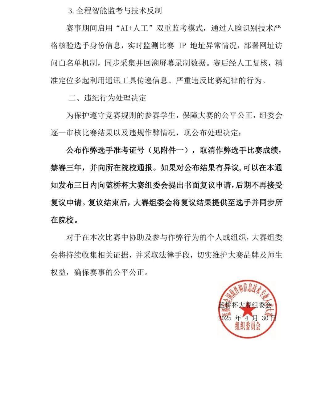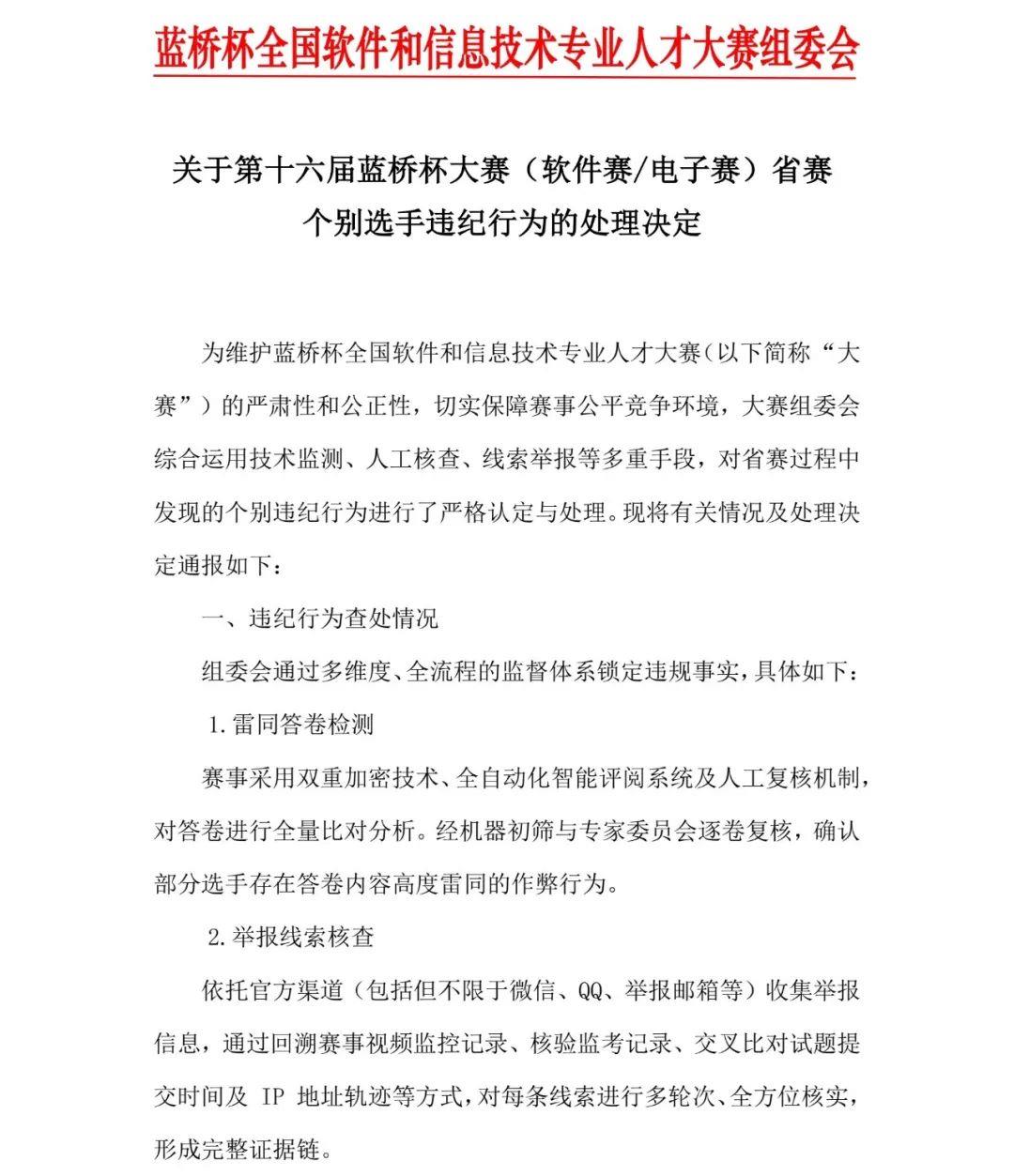 4月30日,蓝桥杯大赛组委会发布《关于第十六届蓝桥杯大赛(软件赛/电子赛)省赛个别选手违纪行为的处理决定》,大赛组委会综合运用技术监测、人工核查、线索举报等多重手段,对省赛过程中发现的个别违纪行为进行了严格认定与处理。
