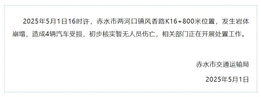 多位网友反映,发生山体崩塌的地点位于贵州赤水丹霞大瀑布景区附近。据上游新闻报道,事发地点并不在景区内部,而是景区外部道路,目前景区仍然正常开放,道路已经恢复。