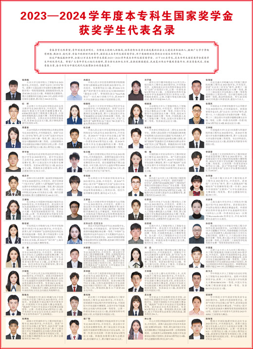 经过严格选拔和评审,全国12万名本专科学生荣获2023—2024学年度本专科生国家奖学金。以下100名学生,是本专科生国家奖学金获奖学生中的优秀代表。希望广大青年学生以他们为榜样,勇当排头兵和生力军,在推进强国建设、民族复兴伟业中展现青春作为、彰显青春风采、贡献青春力量,奋力书写为中国式现代化挺膺担当的青春篇章。
