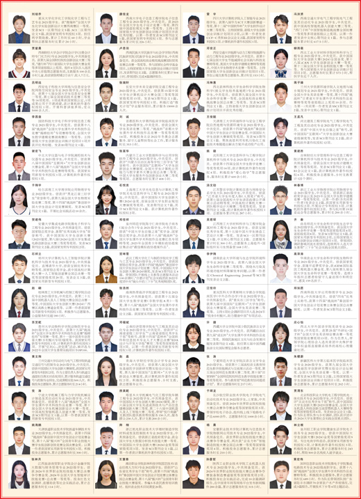 重庆大学化学化工学院化学工程与工艺专业2021级学生。获“微瑞杯”全国大学生化学实验创新设计大赛西南赛区一等奖。发表SCI一区期刊论文5篇、SCI二区期刊论文9篇,获国家发明专利授权3项。担任两学期助教,累计工作时长60小时,学业帮扶志愿服务时长累计24小时。