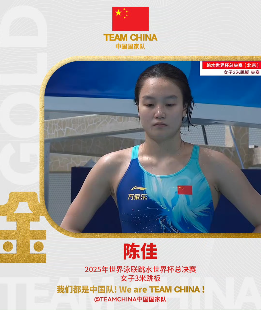 5月4日,2025年世界泳联跳水世界杯总决赛在北京国家游泳中心继续进行。在刚刚结束的女子三米跳板决赛中,中国队选手陈佳夺得冠军,陈艺文获得亚军。二人继此前的世界杯瓜达拉哈拉站和温莎站后,再度包揽该项目冠亚军。