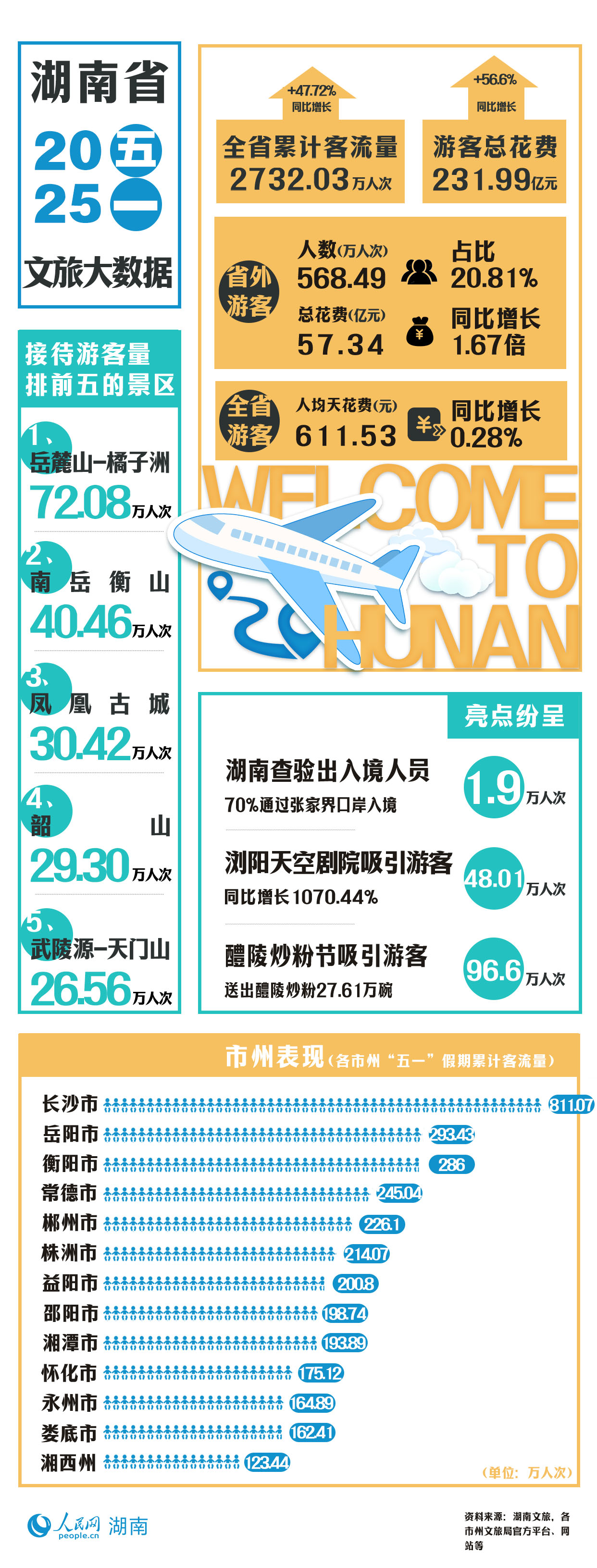 湖南累计接待游客2732.03万人次,同比增长47.72%,接待游客总花费231.99亿元,同比增长56.6%……今年五一假期,湖南文旅数据亮眼。