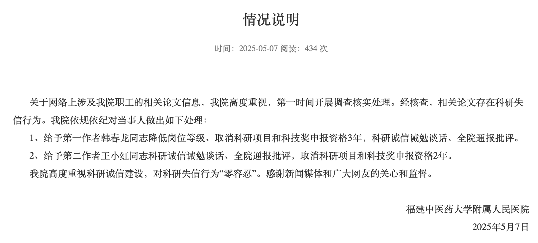 福建省人民医院发布情况说明:妇科论文现男性病例作者被处罚
