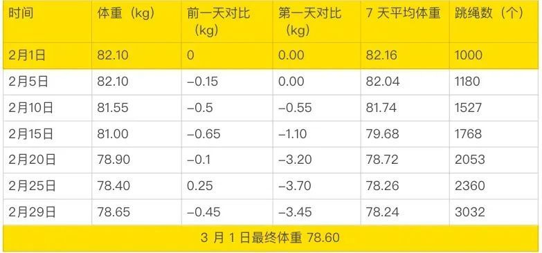 网友记录自己跳绳1个月的体重变化