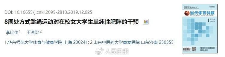 2019年《当代体育科技》期刊发表的一项“8周处方式跳绳运动对在校女大学生单纯性肥胖的干预”的研究发现:8周处方式跳绳运动能有效降低肥胖大学生的体重、脂肪重、体脂率、腰围、臀围等身体成分,具有减肥效果,且能改善肥胖女大学生的心肺功能。③