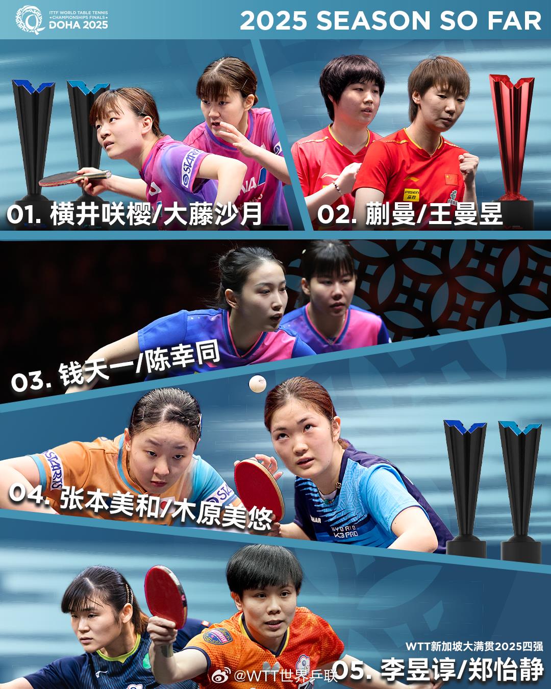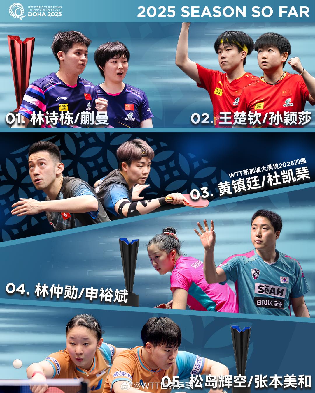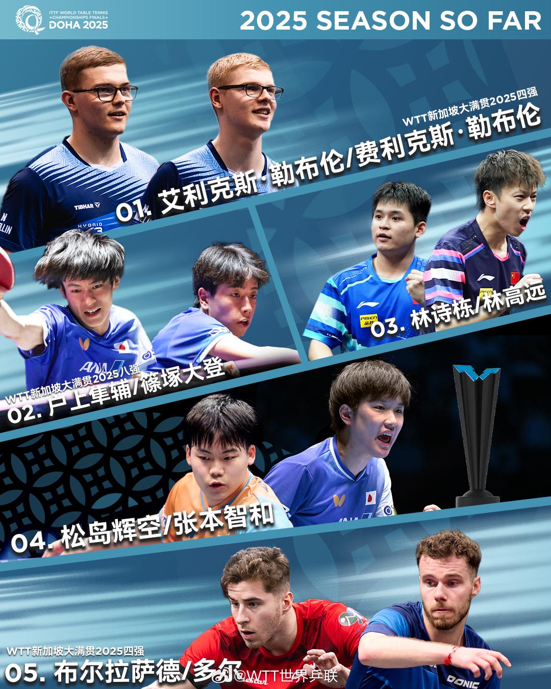 5月8日,2025多哈世乒赛双打前五号种子名单公布。