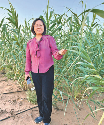 林冬梅在内蒙古阿拉善盟乌兰布和沙漠的菌草防风固沙基地。  |