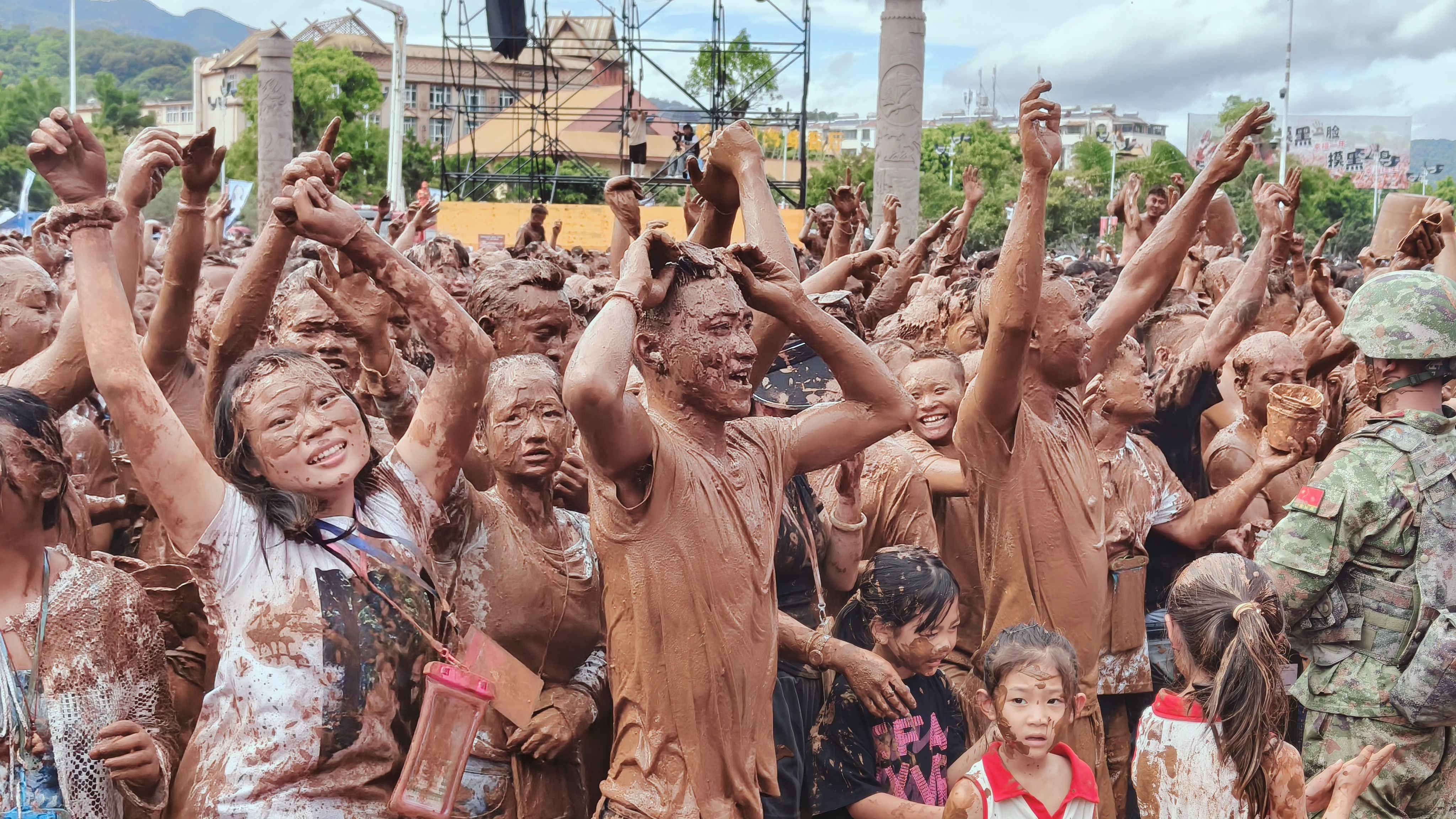 这天,所有人手持泥巴,看到有人便上前招呼,无人能躲过这场独特的“脸部SPA”,为了“摸你黑”!