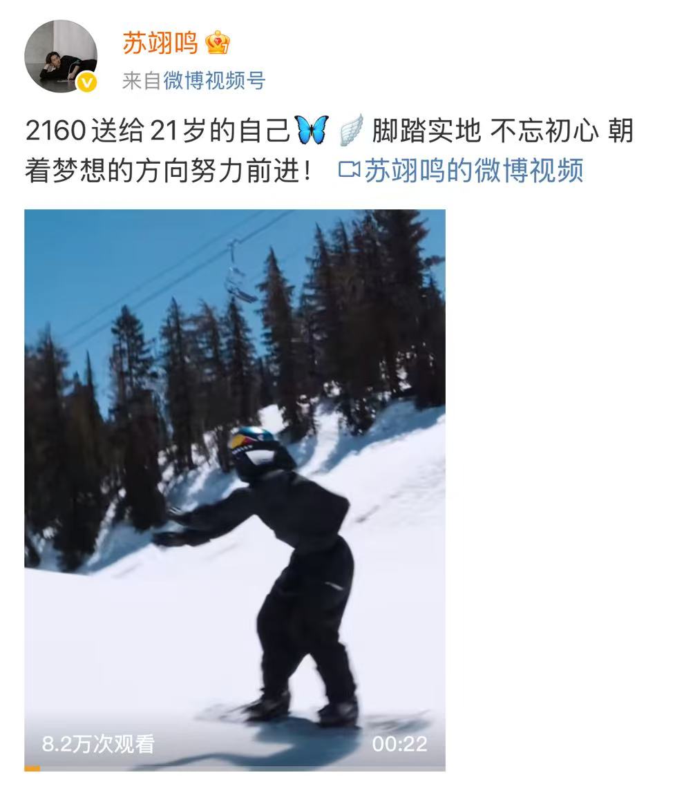 苏翊鸣更新社交媒体写道:“2160送给21岁的自己,脚踏实地,不忘初心,朝着梦想的方向努力前进!”