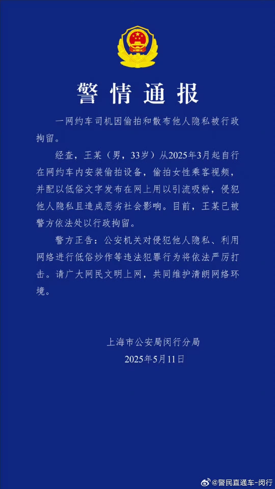 上海市公安局闵行分局5月11日发布“警情通报”:一网约车司机因偷拍和散布他人隐私被行政拘留。