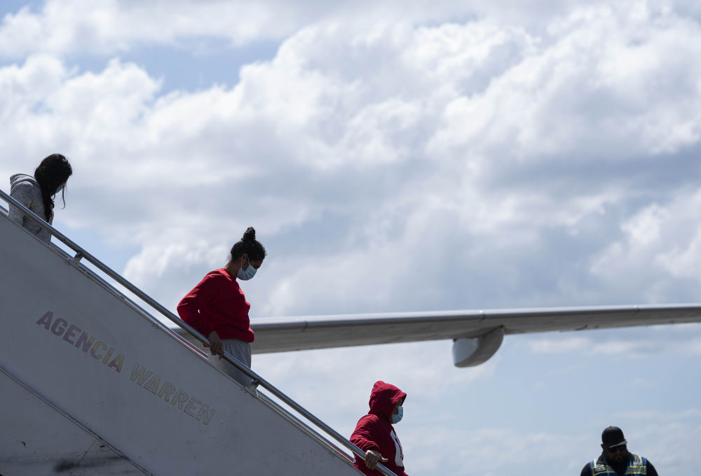 2月14日,在洪都拉斯西北部城市圣佩德罗苏拉的拉蒙·比列达·莫拉莱斯机场,返乡移民走下飞机。新华社发(戴维摄)