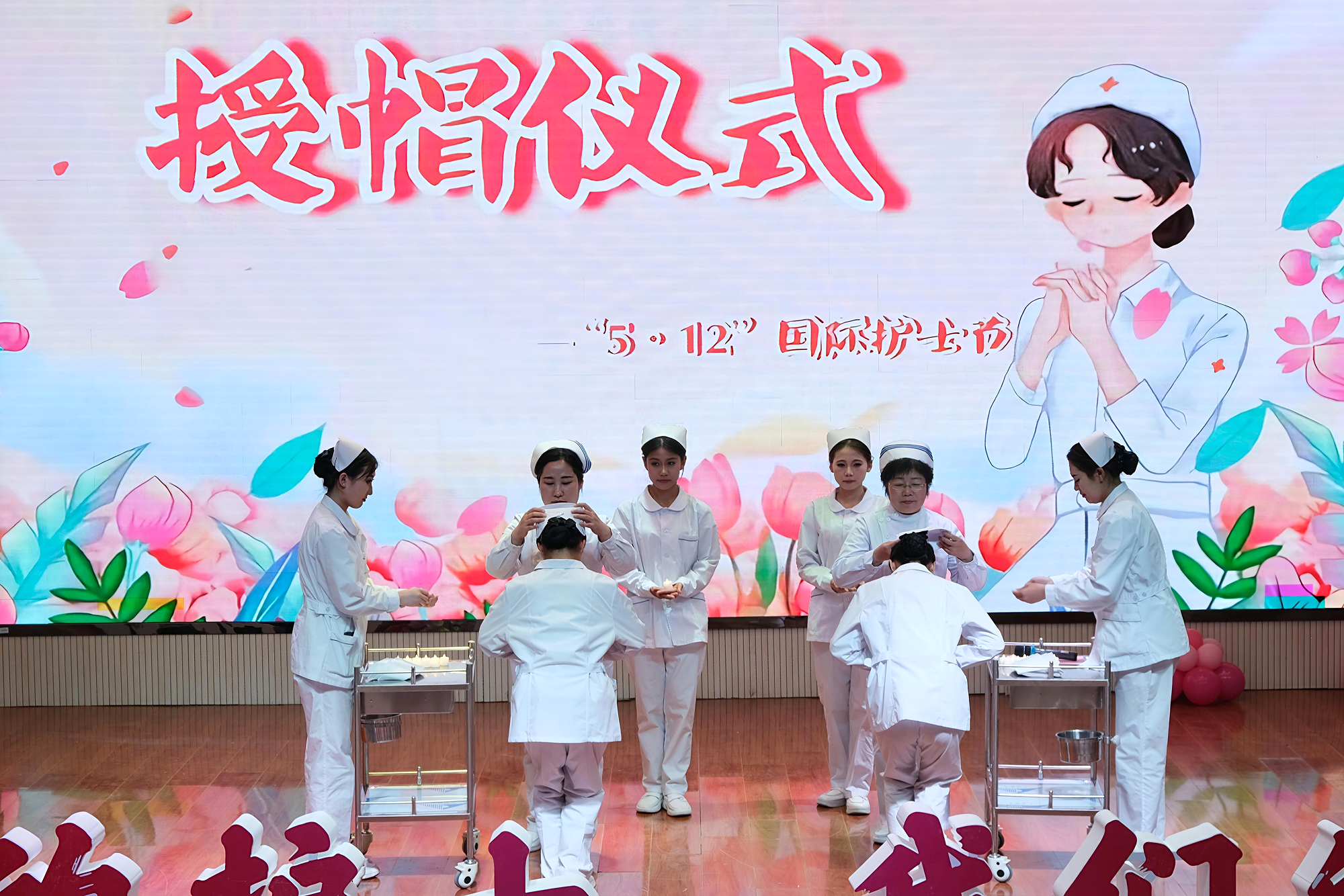 大会在庄严的国歌声中拉开帷幕,学校护理学院对2024-2025学年表现突出的“文明班集体”“优秀护生”等集体与个人进行表彰,激励师生以榜样为引领,勇攀专业高峰。会上文艺表演精彩纷呈,既有青春洋溢的舞蹈《最炫民族风》,也有展现护理学子成长的话剧《从零开始》;配音节目《宁医护理人》以声传情,用四个经典影视片段,通过创意改编台词,演绎护理学子从大一入学到实习的心路历程。护士职业素养大赛获奖队伍通过情景模拟展示了精湛的专业技能与人文关怀。庄严的授帽仪式将活动推向高潮,14名护生接受前辈为其佩戴燕尾帽,并集体宣誓“终身纯洁,忠贞职守”,铿锵誓言彰显了新一代护理人接续使命的决心。伴随着舞蹈《有我》的动人旋律大会圆满落幕。