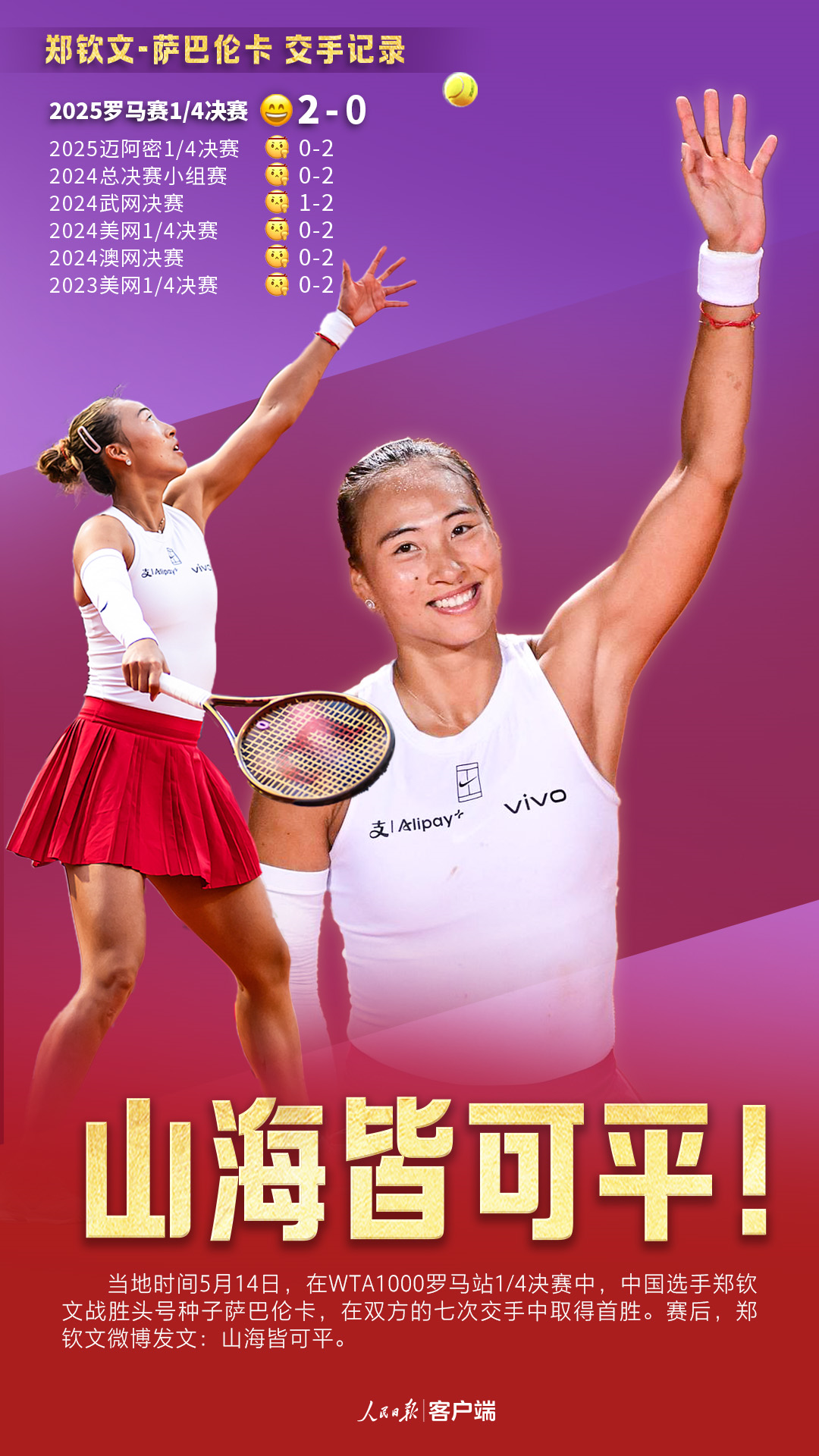 首胜萨巴伦卡,郑钦文赛后发文:山海皆可平