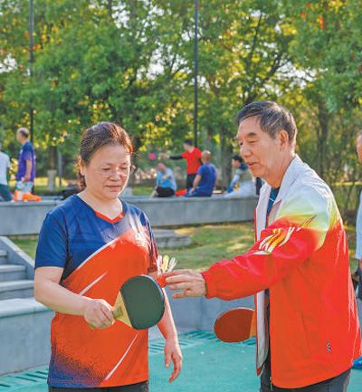 项政惠(右)教爱好者练习嗒嗒球。 |