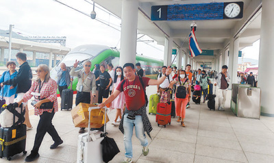 旅客乘坐中老铁路国际旅客列车到达磨憨铁路口岸。