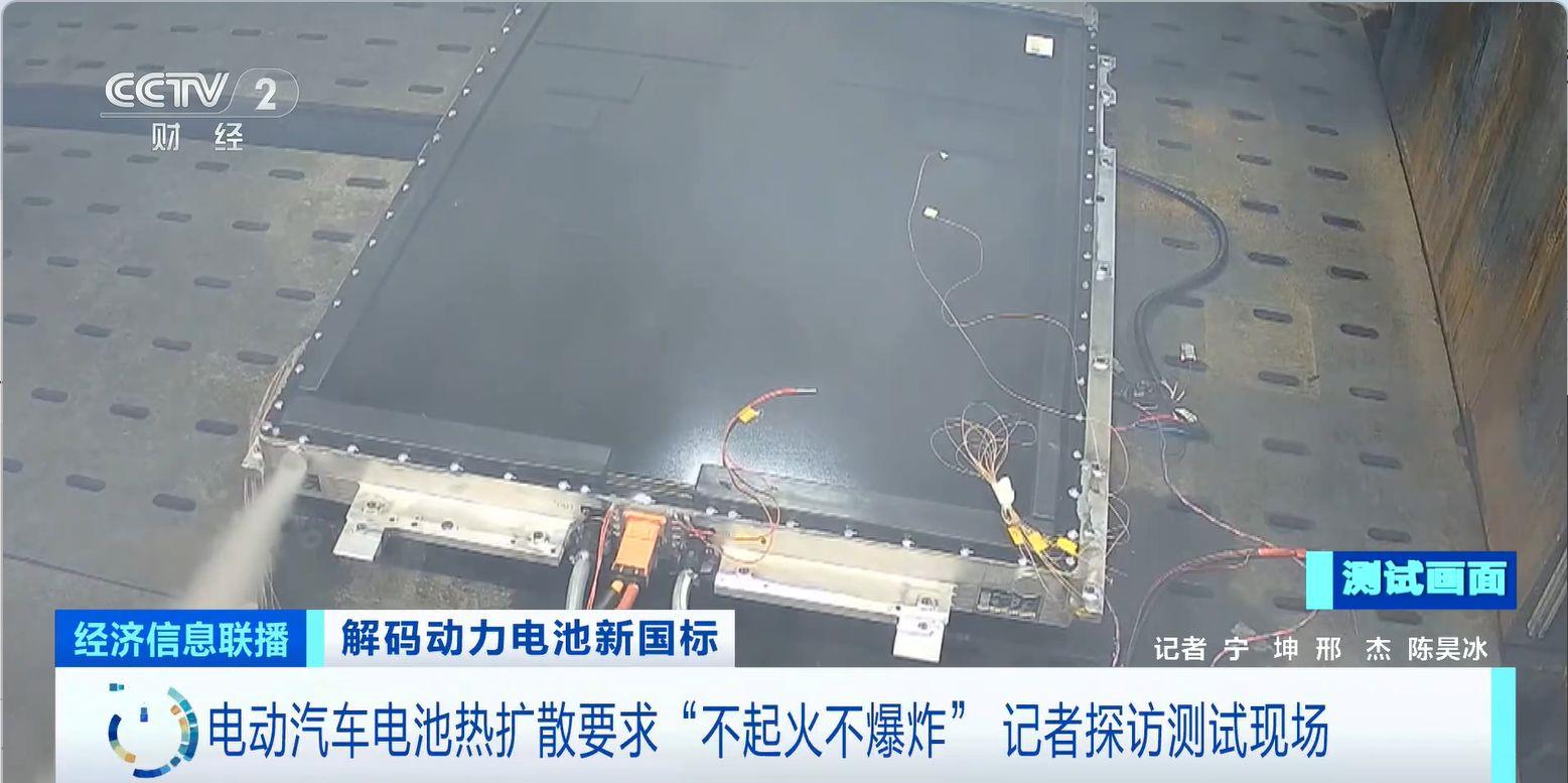 总台央视记者宁坤:在电池测试现场的封闭测试间内,正在进行电池包热扩散试验。通过内部加热的方式,让电池包里的一个电芯的温度快速达到了400摄氏度以上的高温。按照新版国标,即使在这样的情况下,整个电池包的安全防护还是要达到“不起火、不爆炸”的要求。