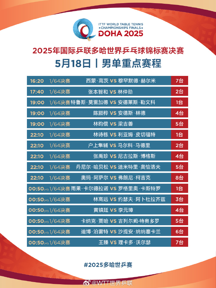 2025年多哈世乒赛今日继续,国乒赛程如下: