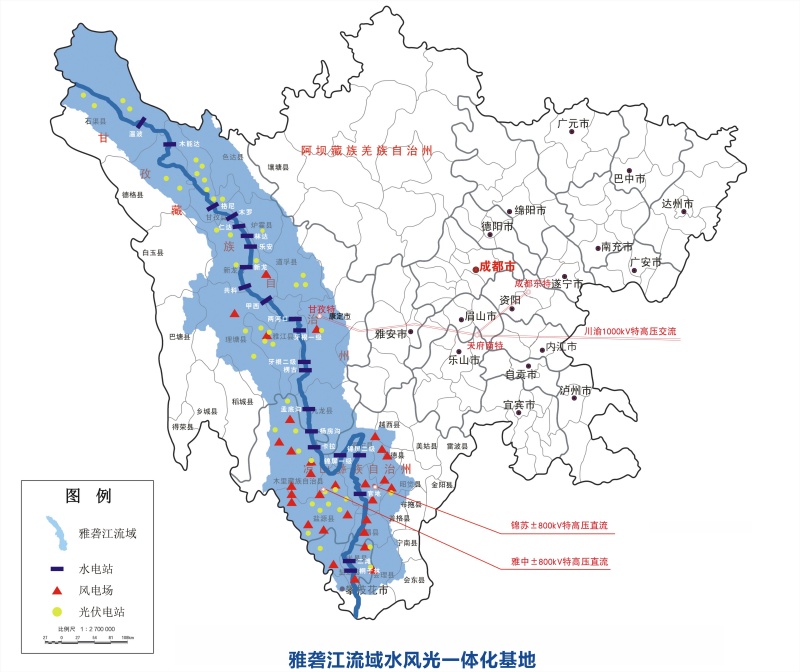 雅砻江流域水风光一体化基地是国家“十四五”规划纲要明确的我国九大清洁能源基地之一,是国家首个水风光一体化示范基地。本阶段规划装机7800万千瓦,规划布局两河口、雅中、锦官、二滩4个水风光一体化项目群。目前,基地已建成7座大型水电站、3大控制性水库和多个风光新能源项目,已投产清洁能源装机近2100万千瓦,在建装机约1400万千瓦,年发电量约1000亿千瓦时,已累计贡献绿色清洁电能超1.1万亿千瓦时。