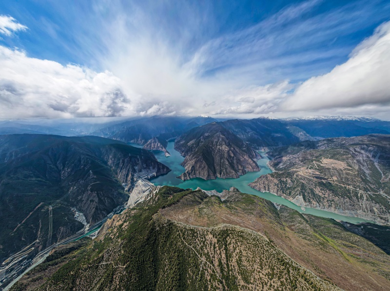 雅砻江流域水风光一体化基地已建成7座大型水电站、3大控制性水库和多个风光新能源项目,已投产清洁能源装机近2100万千瓦。图为世界第一高坝—锦屏一级水电站。