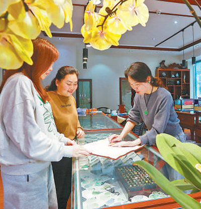 出生在缅甸的余鸿仙(右一)向客人介绍翡翠。